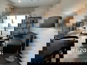 The condo spans 35 sqm and boasts a bright, airy atmosphere, enhanced by large windows and natural light. A modern, open-plan living space welcomes you with chic decor, including a spacious sofa, brick accent wall, and elegant decorative elements. The contemporary kitchen is equipped with sleek countertops, a compact design, and a dining area, perfect for intimate gatherings.