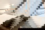 The well-appointed bedroom includes a queen-sized bed with a cushioned headboard, ample lighting, and a large window that invites natural light, creating an oasis of relaxation.