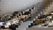 The interiors boast an open-plan design with high ceilings and unique decor elements, such as pendant lighting and artistic room dividers. Modern furnishings and contemporary artwork enhance the luxurious ambiance, while features like wooden accent walls and indoor plants add warmth and style.